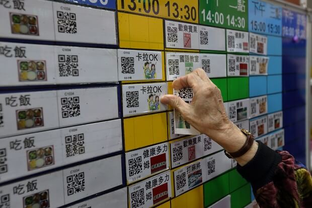 只是,引進台灣的錸工場,也在改良後加入在地元素。工作人員只要用QR Code掃描,再上傳到手機app,就能讓家人也知道長輩的上課狀況。