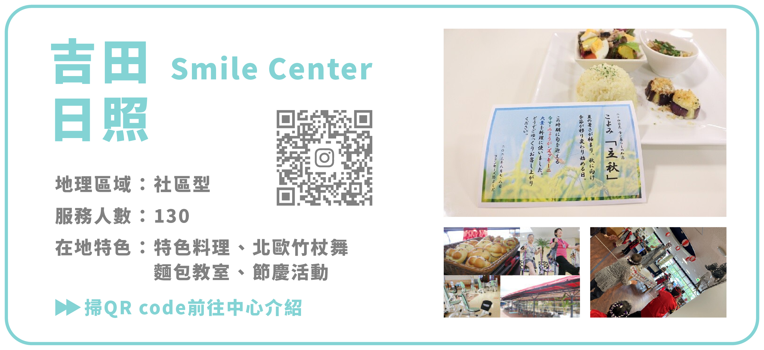 吉田Smile Center成立於2007年7月,致力打造有家庭氛圍的溫馨居住環境,協助每位長者過上真實而重要的生活。雖然有共同生活的基本日常安排,也重視每個人的獨特步調,提供長輩自主選課,讓長輩過上輕鬆寧靜的生活。